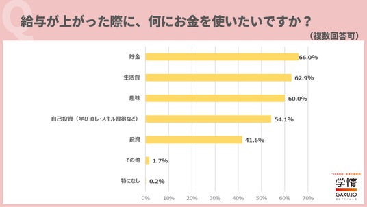 給与が上がった際のお金の使い道は、「貯金」が66.0%で最多。次いで「生活費」62.9%、「趣味」60.0%、「自己投資(学び直し・スキル習得など)」54.1%、「投資」41.6%が続きました。