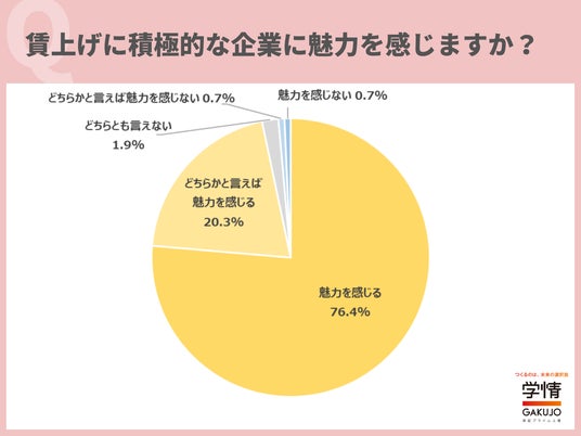 賃上げに積極的な企業について、「魅力を感じる」と回答した20代が76.4%に上りました。「どちらかと言えば魅力を感じる」20.3%を合わせると、96.7%の20代が「賃上げに積極的な企業は魅力を感じる」としています。「仕事を頑張るモチベーションに繋がる」「給与が増えれば、物価高でも生活水準を落とさなくていい」「賃上げに積極的な企業は、安定した売上・利益成長を図れている印象」「従業員を大切にしている企業だと感じる」といった声が寄せられました。
