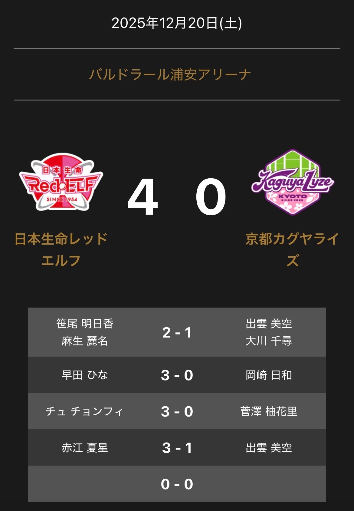 ノジマTリーグ 2025-2026シーズン 公式戦 12月20日(土)開催 日本生命レッドエルフ vs 京都カグヤライズの試合は、4-0で日本生命レッドエルフが勝利しました。