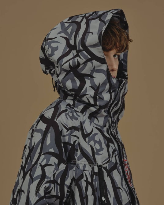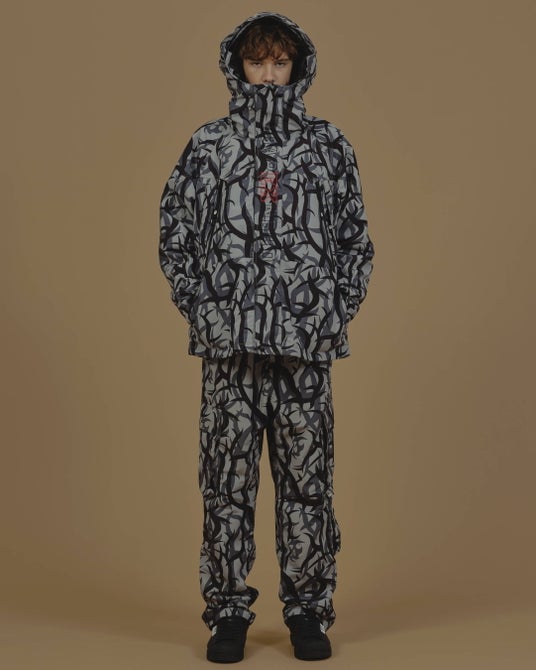 スノーボードジャケットは、前立て部分にコラボレーションを象徴する「BAP“EX”NBHD」のロゴを刺繍しました。表地にポリエステルタッサー素材を、裏地にメッシュ生地とオリジナルジャカード生地を使用。7つのユーティリティポケットを備え、フード口と両裾にドローコードを内蔵しているため、風などの侵入を防ぎます。ソリッドなブラックと“TRIAL CAMO”の2色展開。