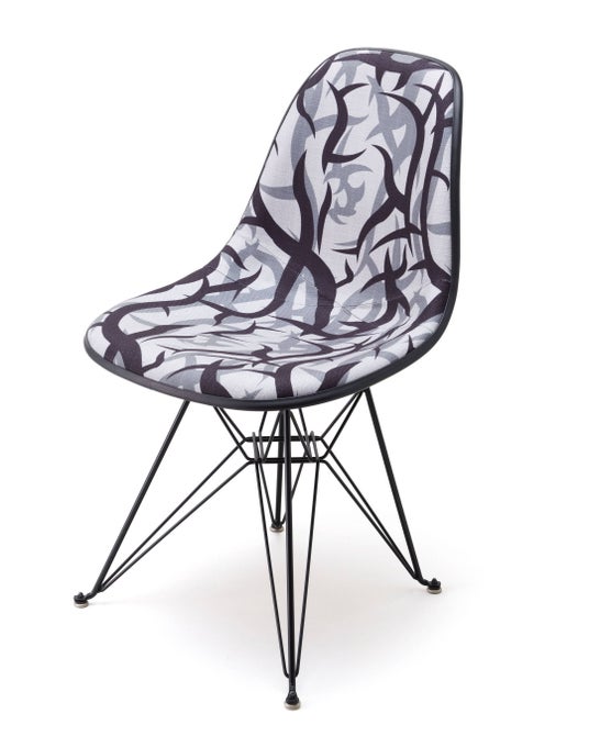 チェアは、ミッドセンチュリー期のもの作りの精神と製法を受け継ぐ数少ないメーカー「MODERNICA(モダニカ)」に別注しました。名作“シェルチェア”に“TRIAL CAMO”を落とし込み、脚部にはエッフェルベースを採用することで、空間に美しく軽やかな印象を与えます。背面には両ブランドのロゴをプリントしたネームラベルを配置。