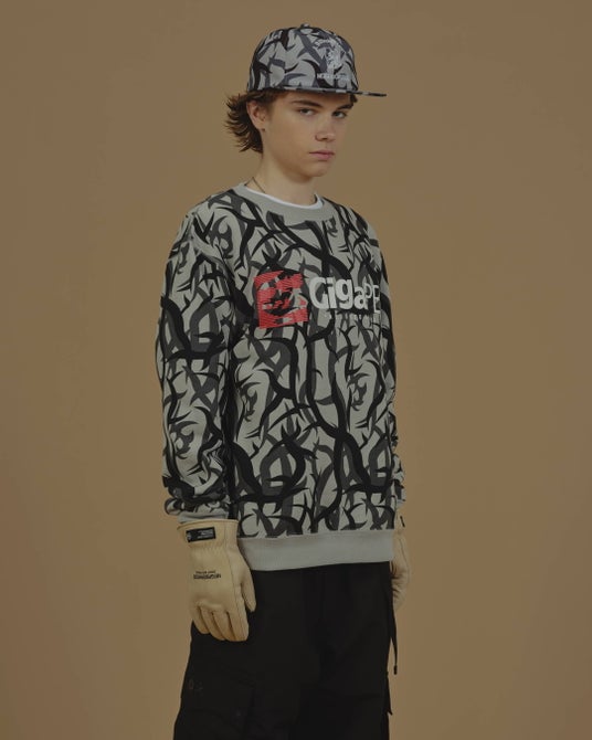 肉厚の裏毛素材を使用したクルーネックスウェットは、1990年代に誕生した“GigaPE”のグラフィックを復刻し、プリントしました。ブラック、グレー、“TRIAL CAMO”の3色展開。