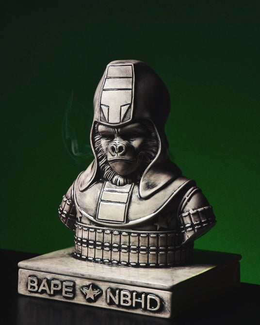 NEIGHBORHOOD(R)のシグネチャーの一つであるインセンスチャンバーは、“GENERAL”をモチーフにデザイン。鼻腔や顔周りから煙が排出される仕様で、台座の“BAPE”と“NBHD”の文字がコラボレーションを象徴します。NEIGHBORHOOD(R)と「KUUMBA(クンバ)」のコラボレーションモデルである甘くフレッシュな香りが特徴のスティク型インセンス「PACIFIC LONG INCENSE」を5本同封。ブラックとブルーの2色展開。