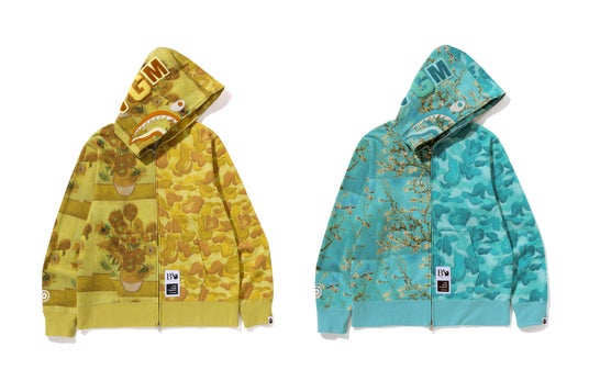 SHARK FULL ZIP HOODIEは、『ひまわり』『花咲くアーモンドの木の枝』の2タイプ展開。右身頃に絵画、左身頃に“OIL PAINTING CAMO”を配置しています。すべてのアイテムには、今回のコラボレーションを記念したスペシャルロゴおよびネームタグが付属します。 本コレクションは、2025年5月31日(土)、A BATHING APE(R)︎正規取扱店舗およびBAPE.COM WEB STOREにて発売します。
