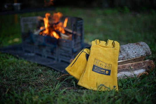 「GRIP SWANY」のルーツでもあるイエローカラーの焚き火用レザーグローブは、甲の部分にコラボレーションを表す両ブランドのロゴを入れました。ロングタイプで耐熱性があるため、ダッジオーブンでも使用できます。
