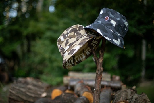 ハットは、「GRIP SWANY」のバケットハットがベース。ブラックとベージュのBAPE(R) CAMOをそれぞれ使い、ブリムの裏側にA BATHING APE(R)︎のロゴをプリント。