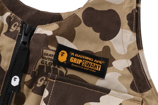 「GRIP SWANY」の定番アイテムをベースに、BAPE(R)︎の象徴でもあるAPE HEADや新しいBAPE(R) CAMOなどのグラフィックを大胆に纏ったレザーグローブ、ハット、Tシャツ、ロングスリーブTシャツ、ギアバッグベスト、ギアパンツ、ギアショーツ、タープ、テントがラインアップします。