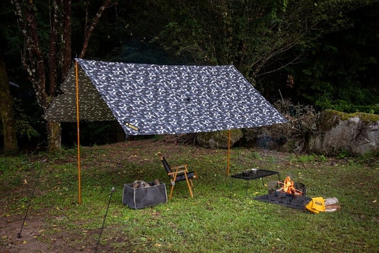軍でも使用されている難燃ミリタリーファブリック“ブレイズ シールド”によるタープをBAPE(R) CAMOでアレンジ。テントサイトとの相性を選ばないブラックとベージュの2色展開。従来のタープよりもループとハトメを多く配置し、補強布とステッチを施してあるため、堅牢性がアップしています。本体を丸めて折り畳み、付属のベルトに結束するだけでコンパクトな形状になるので、持ち運びにも便利です。