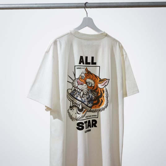 45周年を記念したオールスターに合わせた限定Tシャツが登場。前面はスカジャンをイメージし、右胸にALL STARのアイコンでもある「★」のマークを漢字で表現した「星」、左胸には和柄の虎がオールスターを咥えたデザインをプリント。背面にはインパクトのあるグラフィックを配置し、どこから見ても目を引く仕上がりです。オリジナルパッケージに封入され、コレクター心をくすぐる仕様となっております。