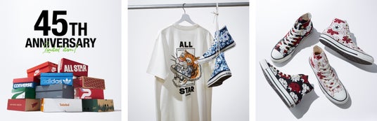今年、創業45周年を迎えたABC-MARTは、記念すべきアニバーサリーイヤー企画として、11にもおよぶブランドとタッグを組み、45周年限定モデルを制作し、8月より順次発表しています。第1弾~第6弾でのアディダス、NIKE、VANSなどの限定モデルとの豪華コラボレーションを経て迎える待望の第6弾は、CONVERSEの王道モデル「ALL STAR」から限定デザインシューズと、オリジナルTシャツです。