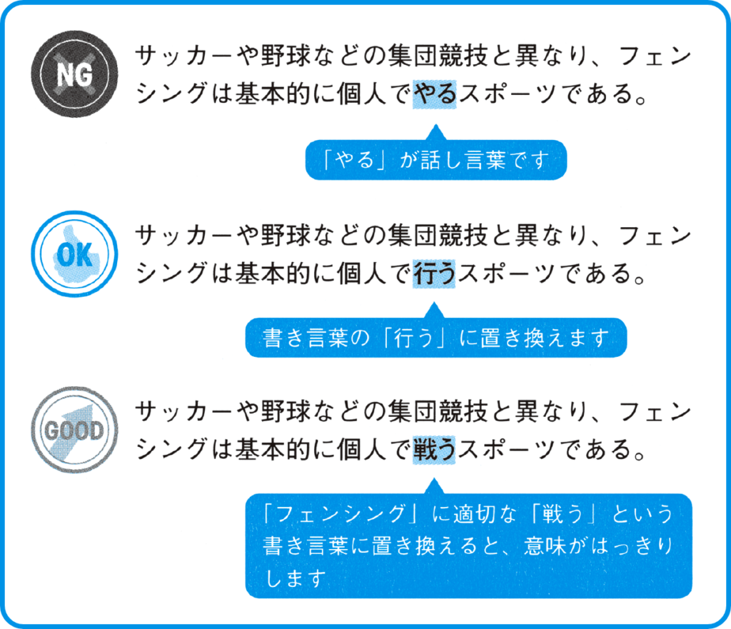 たとえば、文例にある「〇〇をやる」は話し言葉です。したがって別の言葉に置き換える必要があります。その最も簡単な方法は、OKのように、書き言葉の「行う」を使うことでしょう。