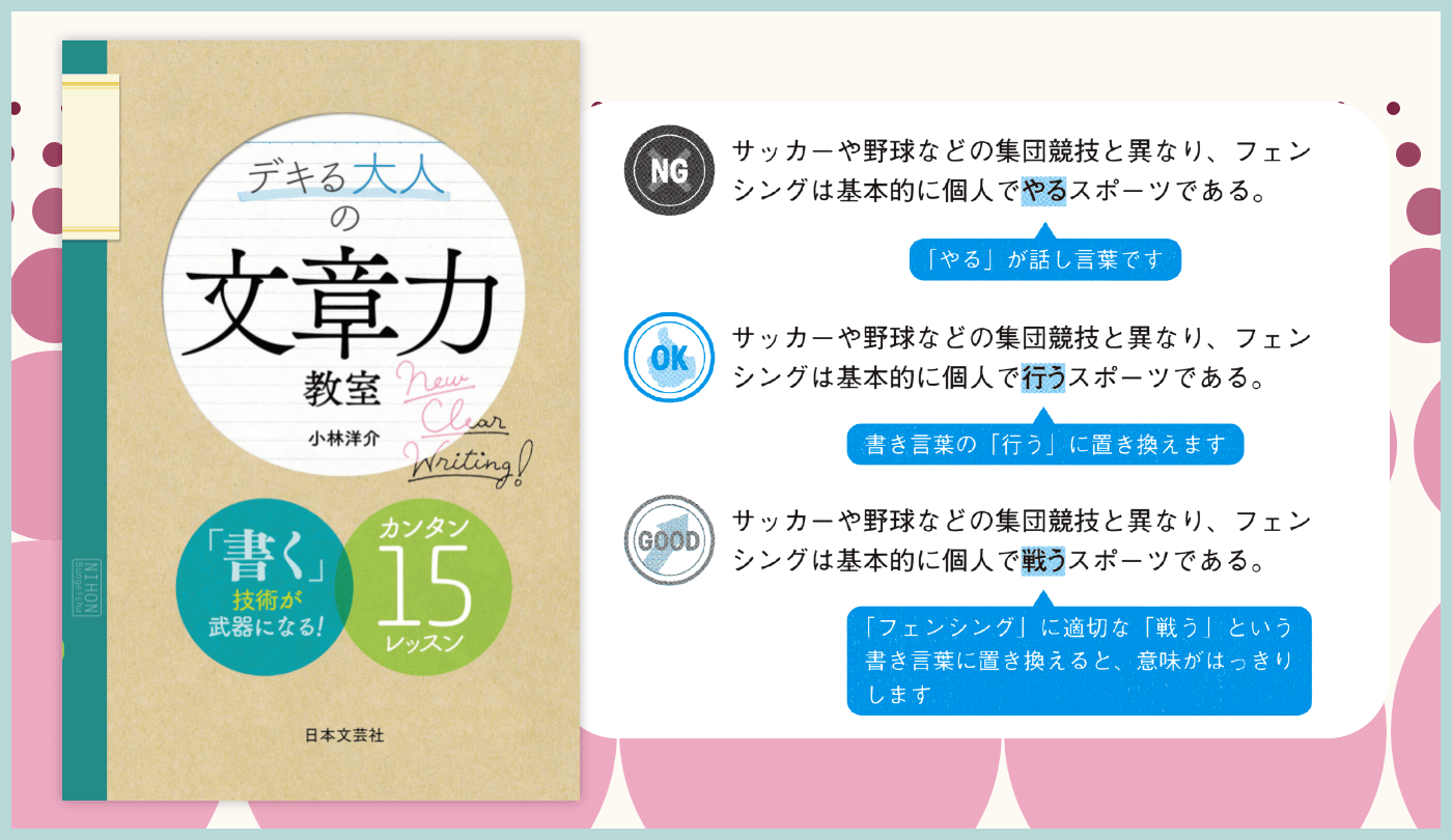 文章力アップのテクニックを紹介。今すぐ使える簡単なテクニックから丁寧に解説。テーマがつかみやすいタイトルや要点、違いがひとめでわかるNG文例とOK文例のポイント説明など、わかりやすさにこだわった構成も特長。