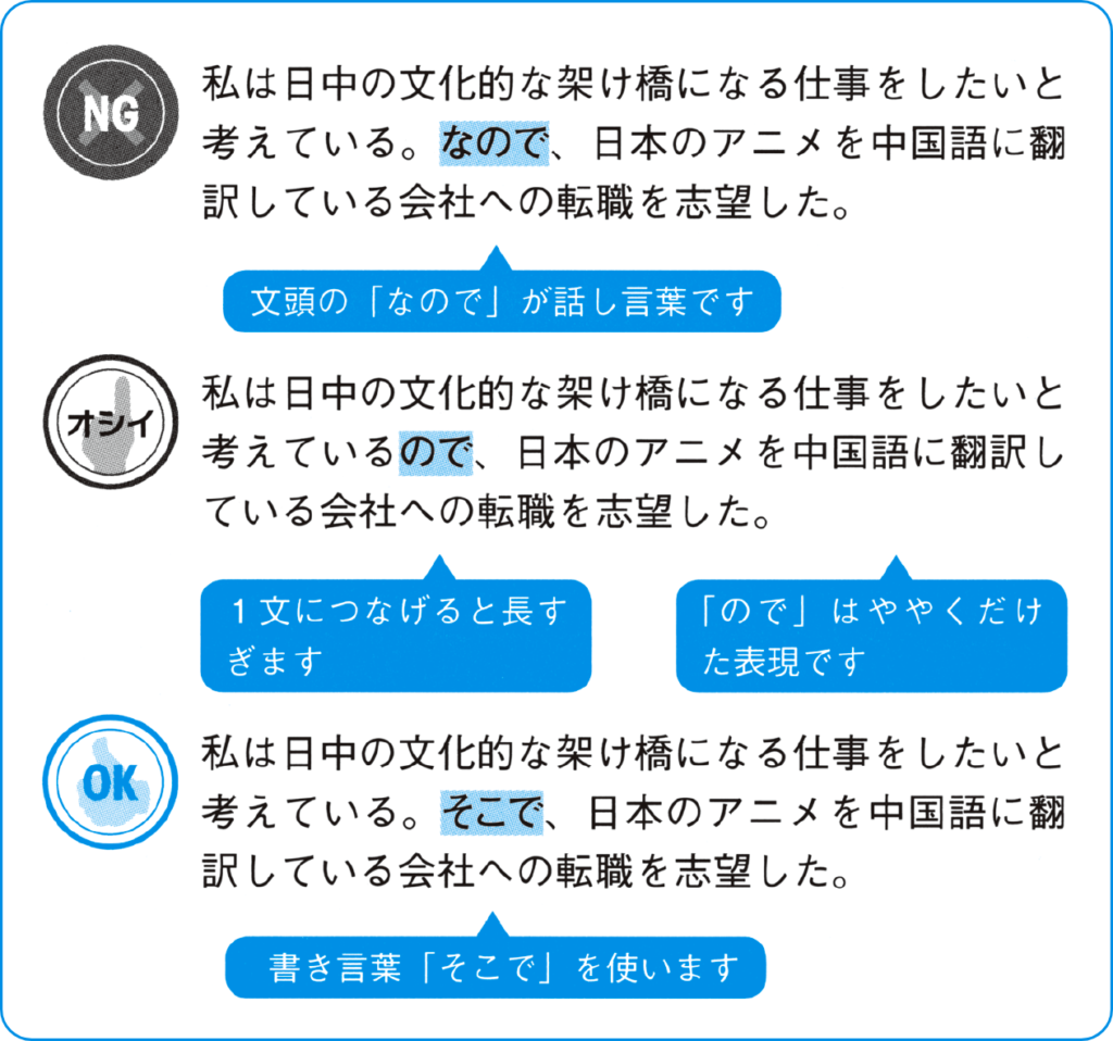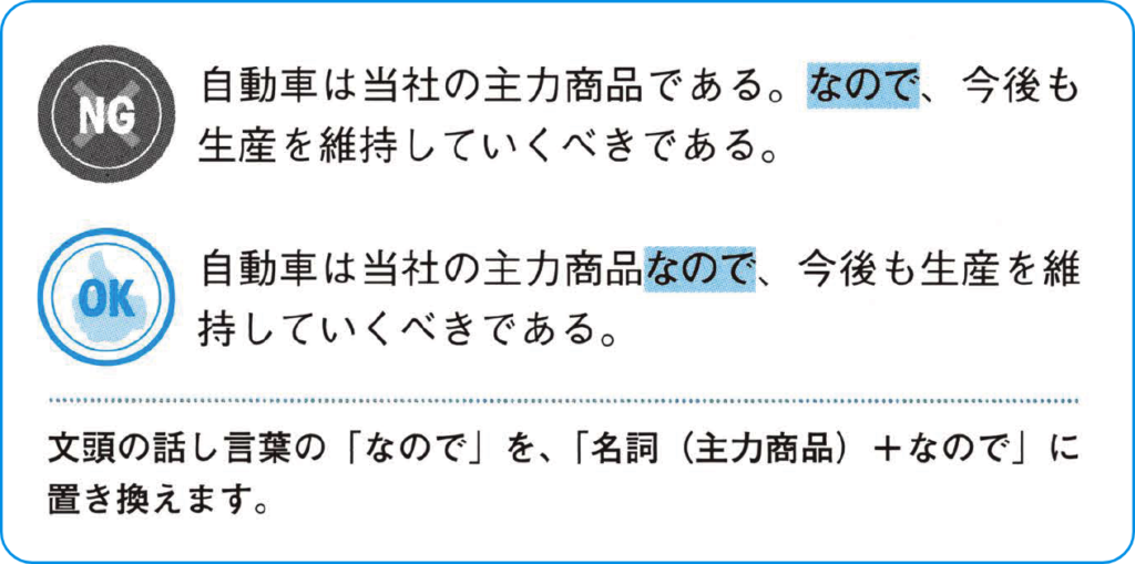 話し言葉は使わない -【文頭に「なので」「だから」は置かない】