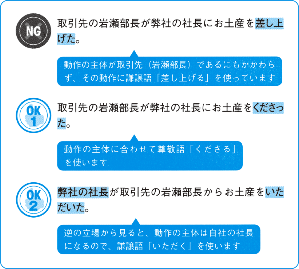 NG では、お土産を受け取るという動作ではなく、お土産をあげるという動作について述べています。お土産をあげるという動作を行ったのは取引先の部長で、受け取るという動作を行ったのは弊社の社長です。この場合、取引先の部長は弊社の社長より目上として表現すべきです。