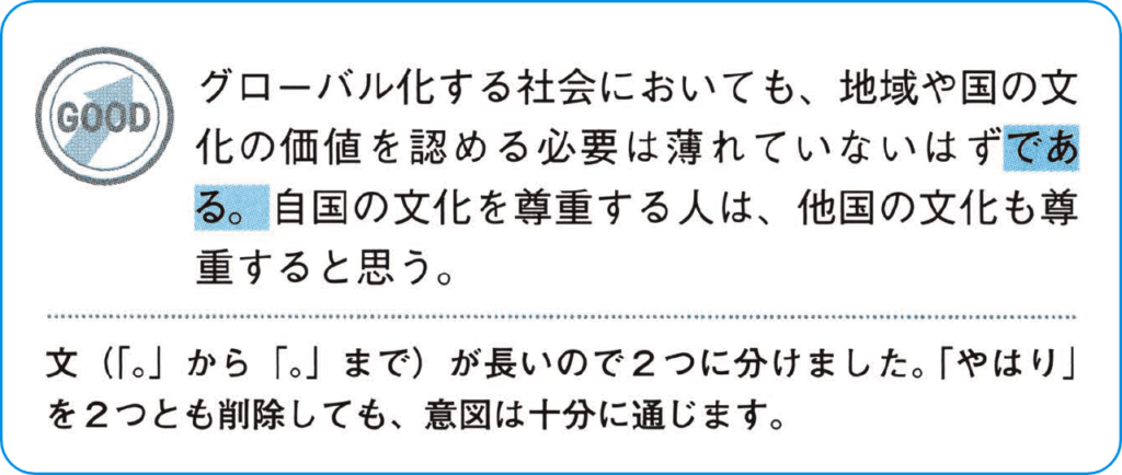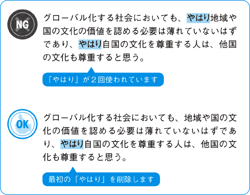 NG の場合、「やはり」は逆接に近い意味で使われています。1 つ目の「やはり」は、社会がグローバル化しているけれども、それでもなお、グローバルでマクロな視点だけではなく、「地域や国」というミクロな視点も必要だ、ということです。それでは、2つ目の「やはり」はどういう意味でしょうか。もし、2つ目も逆接に近い意味だとすると、1つの文の中に逆接が2回出てくることになり、書き手の意図とは異なる意味になるでしょう。