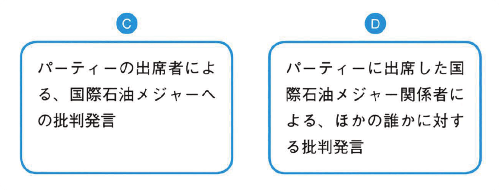 ③「国際石油メジャーの批判発言」の「の」は、次のCであるのか、Dであるのかがわかりにくくなっています。