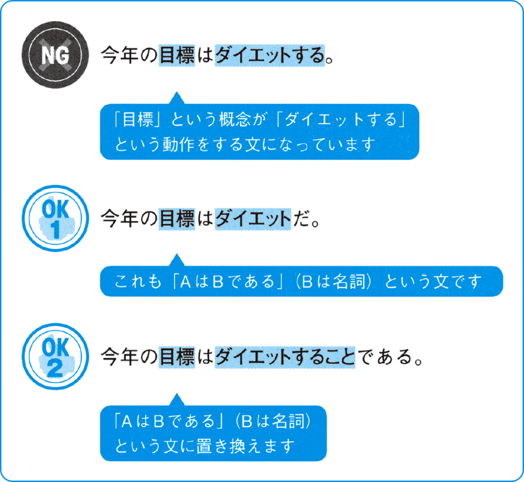 「目標」自体が「ダイエットする」ことはありません。書き手がダイエットするのです。NGの「目標はダイエットする」のような「AはBする」という文では、「Bする」(動詞)は動作なので、「A」(名詞)が動作しないモノ(コト)であってはなりません。「AはBする」の「A」(主語)が動作するモノなのが、動作しないモノなのかを考えましょう。「動作しないモノが動作する」という文は間違いです。この問題を解消するため、OK1では文末を「Bする」という動詞ではなく「Bだ」「Bである」に置き換えています。OK2については書籍52〜53ページで詳しく解説します。