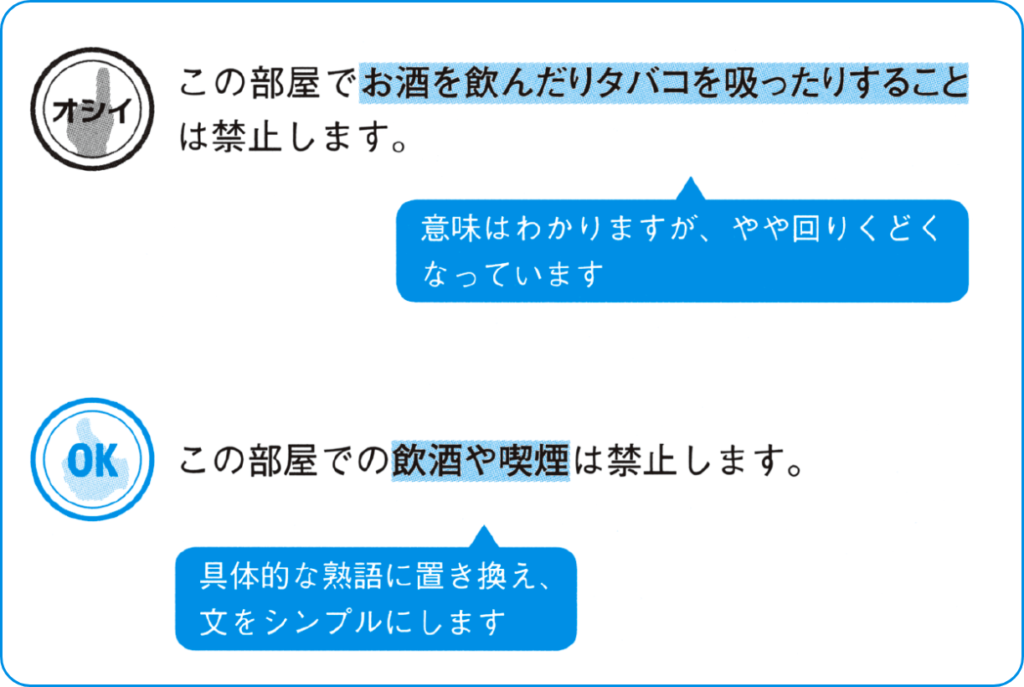 多くの場合、「お酒を飲むこと」(名詞句)よりも「飲酒」という熟語(漢字2文字以上で構成されて1語になった単語)を使ったほうが、名詞句より少ない文字数で同じ意味を表すことができます。ただし、文書の種類や読み手によっては、難しい熟語は避けなければなりません。