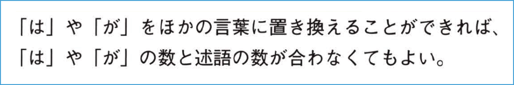 「ゾウは鼻が長い」は「ゾウの鼻は長い」と置き換えることができます。こうすれば「は」の数と述語「長い」の数は一致します。