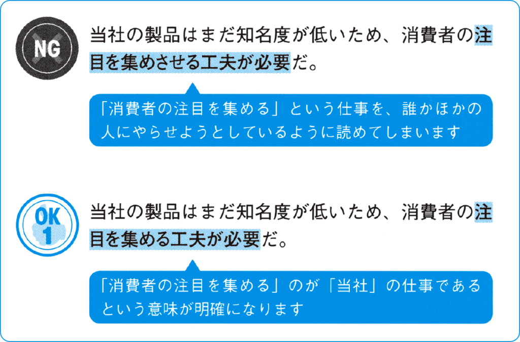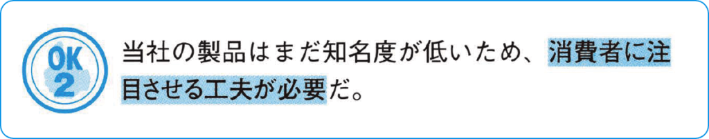 NGで最も問題になる後半部分の「消費者の注目を集めさせる」では、「注目を集める」のが「当社」ではないほかの誰かになっています。「注目を集める」のが「当社」の仕事であることを明確にした文がOK1です。