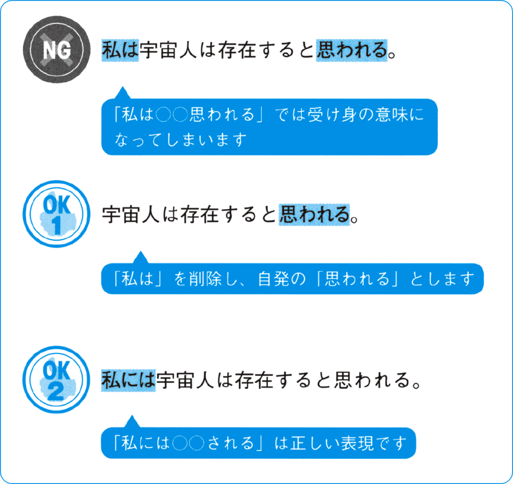 自発の意味で「思われる」「感じられる」「考えられる」などを使う場合は、OK1のように「思う」の主体を省略するか、OK2のように「〇〇には」の形にするべきです。ただし、OK1のように表現すると、「私だけではなく誰でもそう思う」というニュアンスが含まれるので、誰もがそうは思うとは限らない内容については使わないようにしましょう。