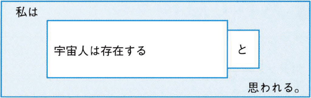 また、「私は宇宙人は存在すると思う」のように、主語を「私」にし、それに対応して述語を「思う」にすれば、内側は書き手の考えであり誰もがそう思うわけではないことが明確になります。