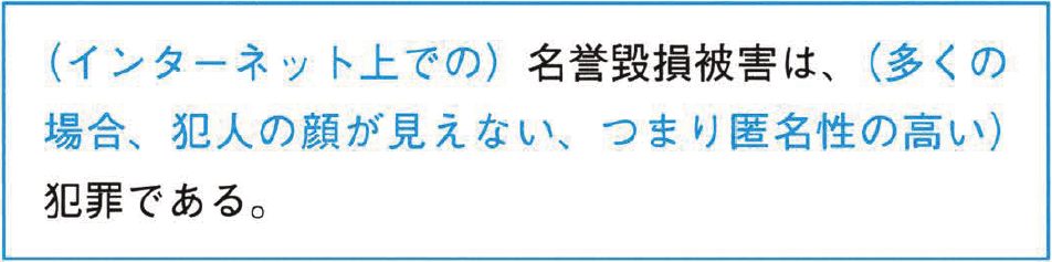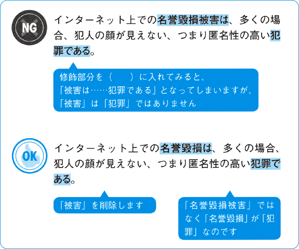 修飾語を( )に入れると、「名誉毀損被害は……犯罪である」となります。しかし、「被害」は「犯罪」ではありません(被害者が逮捕されてはたいへんです)。つまり、NGでは、イコールにならないものを文法的にイコールにしてしまっているのです。そこで、OKのように不要な語句を削除したり、場合によってはほかの語句に置き換えたりして、「AはBする」「AはBである」の関係が正しく成り立つようにします。