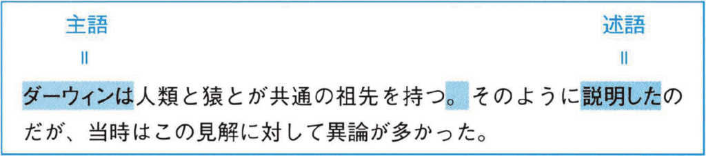 最初の文には「持つ」という述語がありますが、『持つの主語は「人類と猿」であり、「ダーウィン」ではありません。それでは、ダーウィンは何をしたのかというと、「説明した」のです。つまり、「ダーウィン(主語)は説明した(述語)」の間に「。」が入ることで、文の形が壊れてしまっているわけです。