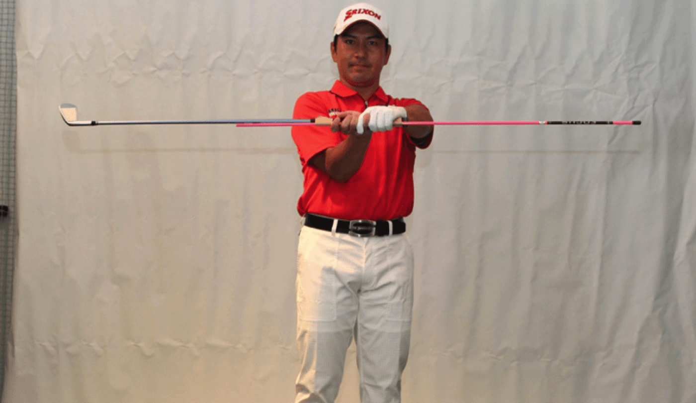 わかりやすく説明するために細い棒を使います。練習用に市販されている樹脂製のスティックがあれば最高ですが、用意できない場合はクラブをもう1本使っても大丈夫です。