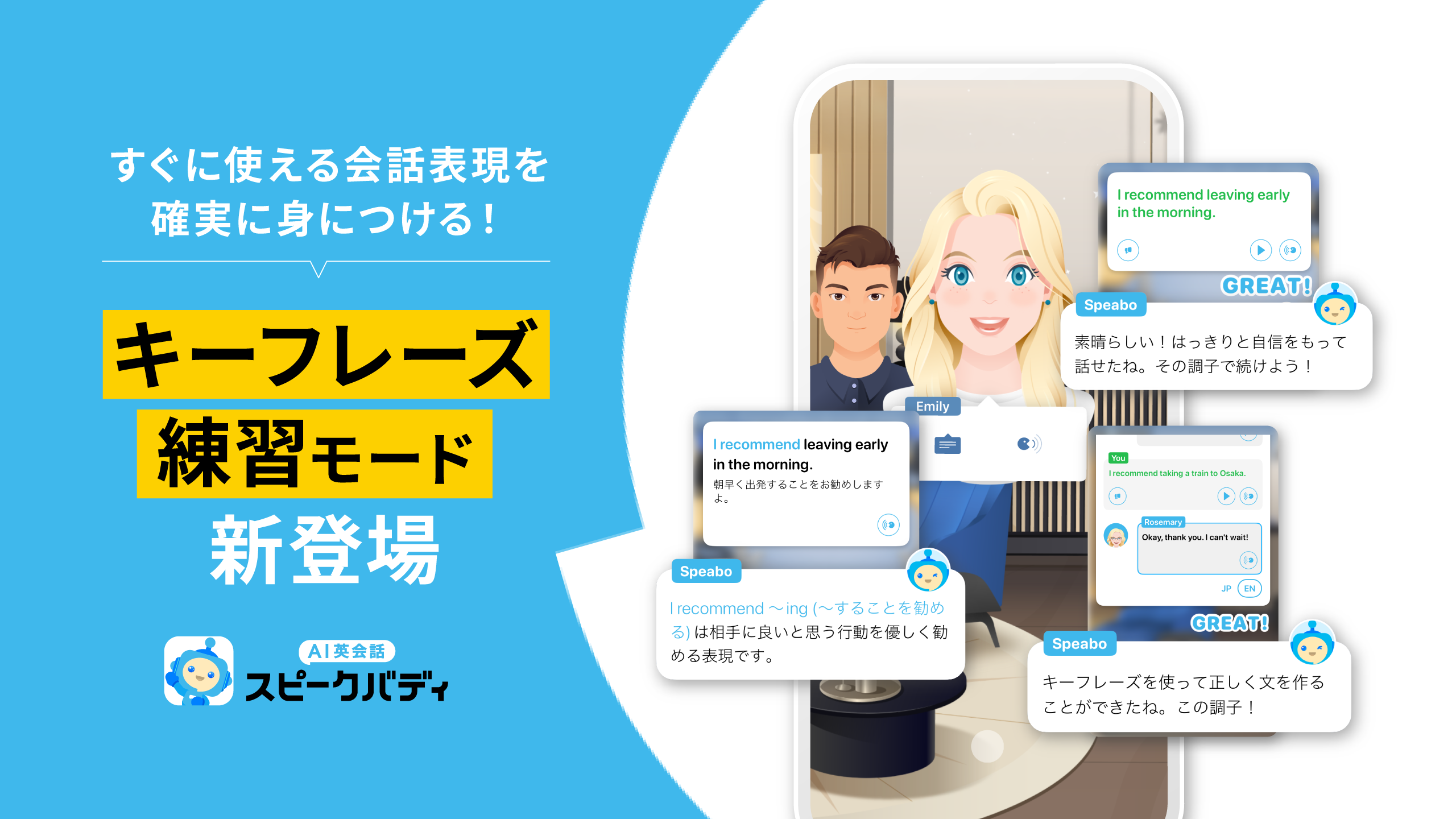 株式会社スピークバディ(東京都中央区、代表取締役CEO:立石剛史、以下「当社」)は、当社が開発・運営する「AI英会話スピークバディ(以下、スピークバディ)」において、従来のレッスン構成を刷新し、会話で頻繁に使われる英語表現“キーフレーズ”の習得をサポートする新機能「キーフレーズ練習モード」を提供開始いたします。