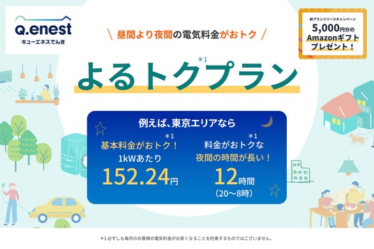 Q.ENESTホールディングス株式会社(所在地:東京都港区、代表取締役:張 熙載)の子会社、Q.ENESTでんき株式会社(所在地:東京都港区、代表取締役:張 熙載 以下、当社)は、夜間に電気を多く使用するライフスタイルのお客様向けに、新たな料金プラン「よるトクプラン」(以下、本プラン)を2025年3月1日(土)より提供開始※¹いたしました。