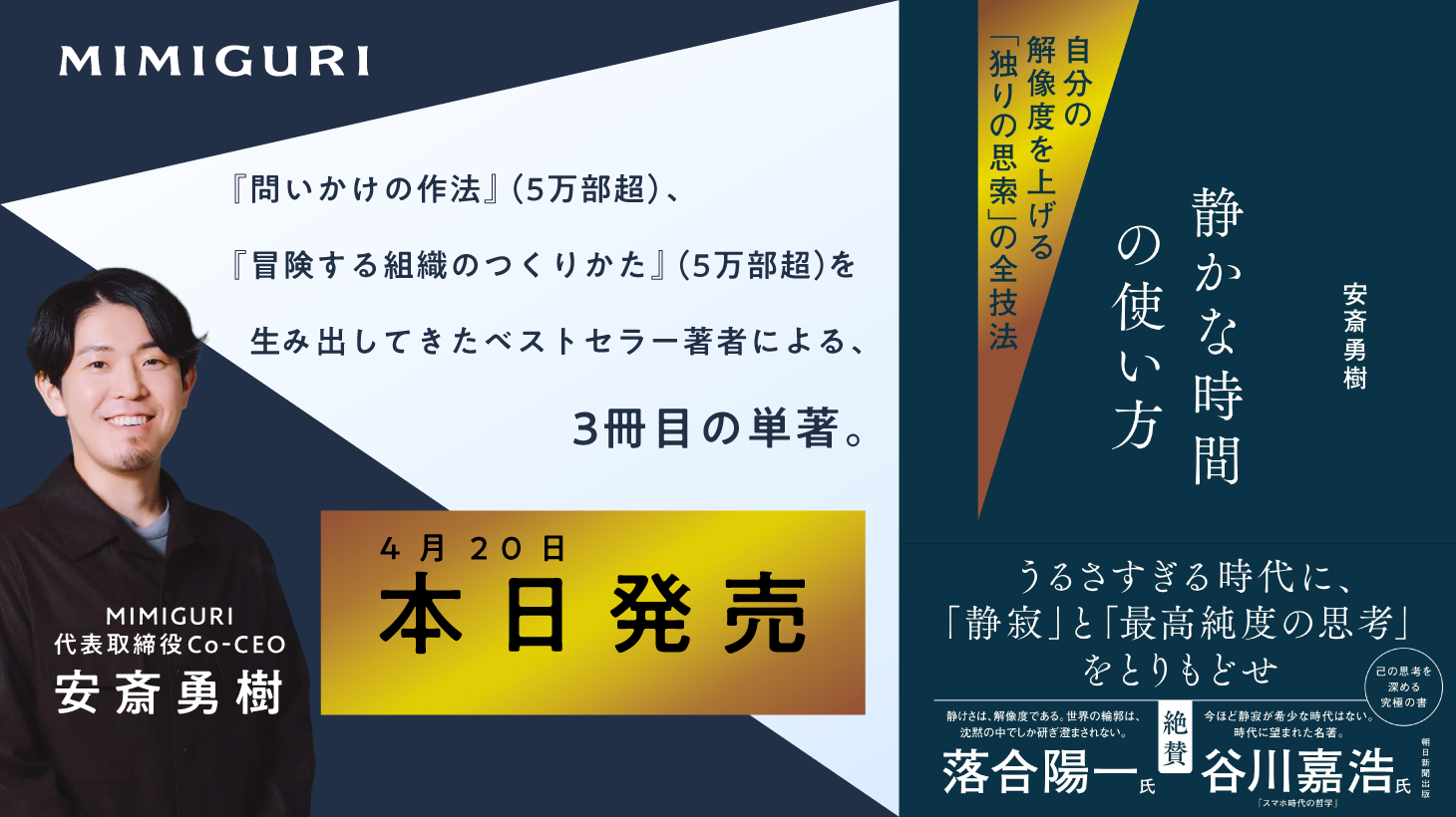 株式会社MIMIGURI(本社:東京都文京区、代表取締役Co-CEO:ミナベトモミ、安斎勇樹)は、当社代表取締役Co-CEO 安斎勇樹の新著『静かな時間の使い方──自分の解像度を上げる「独りの思索」の全技法』(朝日新聞出版)が、2026年4月20日(月)より発売されたことをお知らせいたします。