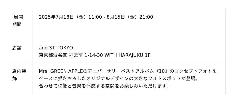2013年結成。デビュー10周年を迎える2025年は、“MGA MAGICAL 10 YEARS”と称して、7月8日(火)にベストアルバム『10』のリリース、7月26日(土)、27日(日)に神奈川県横浜市・山下ふ頭にて2日間で10万人動員予定のライブ『MGA MAGICAL 10 YEARS ANNIVERSARY LIVE ~FJORD~ 』を開催、全国の商業施設とコラボレーション、全国での展覧会、韓国での初単独公演、さらに初のドキュメンタリー映画を製作など、さまざまなプロジェクトを発表している。さらに今年10月から12月にかけて、12公演で55万人を動員予定の自身最大規模となる5大ドームツアー『Mrs. GREEN APPLE DOME TOUR 2025 “BABEL no TOH”』を開催予定。