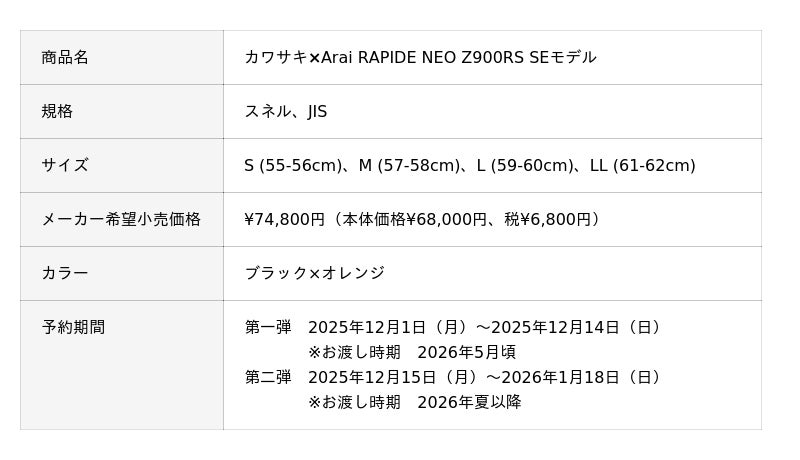 株式会社カワサキモータースジャパン(本社:兵庫県明石市、代表取締役社長:佐伯 健児)は、Araiコラボモデル『カワサキ×Arai RAPIDE NEO Z900RS SEモデル』を2025年12月1日(月)より全国のカワサキプラザで店頭予約販売を開始することをお知らせいたします。