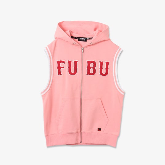 スウェットベストはフロントの大胆な刺繍が印象的で、袖口のダブルラインはバスケットボールのユニフォームから着想されアクセントとなっております。スウェットパンツはフロントにFUBU、バックにatmos pinkのロゴ刺繍を施し、スウェットベストとセットアップスタイルにもなるカラー展開です。