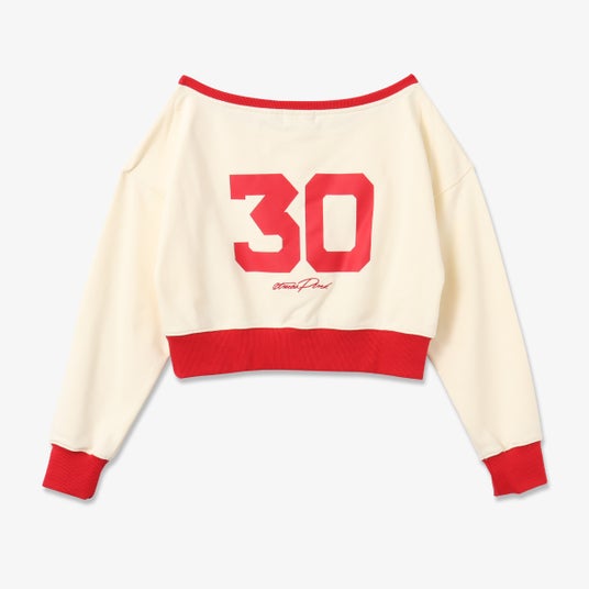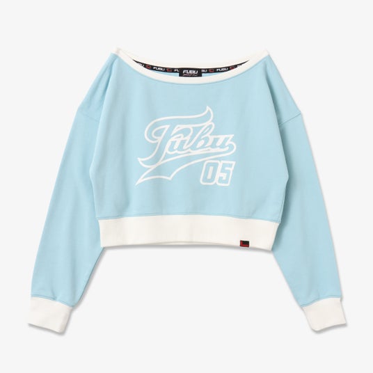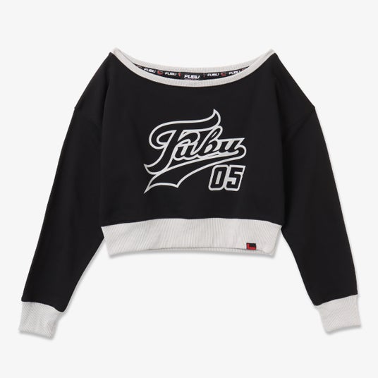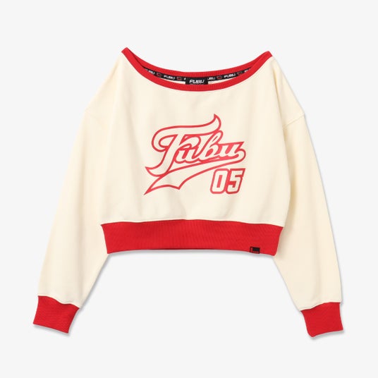 オフショルダートップスはフロントにFUBUのロゴ、バックにはユニフォームをイメージし数字を配置したスポーティなデザインと女性らしいシルエットが融合したデザインに。