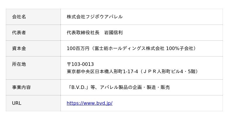 1876年にアメリカ・ニューヨークで誕生したアンダーウェアブランド。Bradley、Voorhees & Dayの頭文字を冠したB.V.D.は、"THE AMERICAN STANDARD"として品質と機能性を追求し続け、150年以上にわたり世界中の消費者に愛されています。日本ではライセンス契約を交わす富士紡ホールディングス株式会社グループの株式会社フジボウアパレルが展開しています。【会社概要】