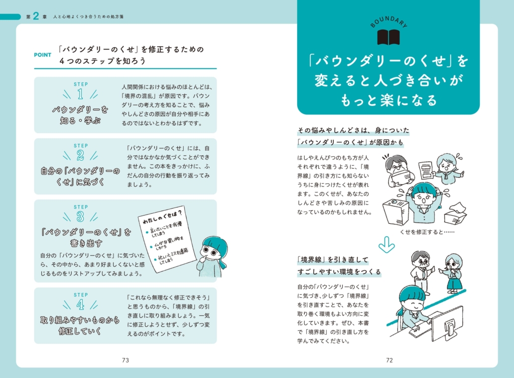 さらに境界線を細い「ライン」と、幅をもたせた「ベルト」として捉える考え方も提案。相手や状況に応じて無理なく距離を調整する方法がわかります。