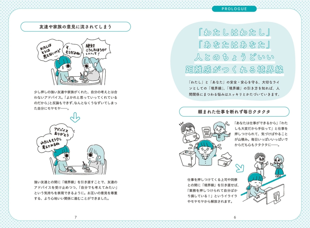 人間関係をもっとラクに、安心・安全にするために、「わたし」と「あなた」のあいだに心地いい境界線をつくるアイデアをまとめました。悩んだときに「境界線」を引き直すための、誰でも取り入れやすい方法ばかりです。