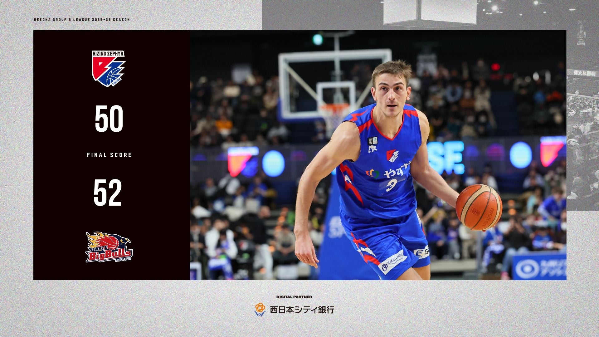 2026年2月8日(日)に開催した、りそなグループ B.LEAGUE 2025-26 シーズン【ライジングゼファーフクオカ vs.岩手ビッグブルズ】戦は、“福岡 50-52 岩手”で福岡の敗戦となりました。