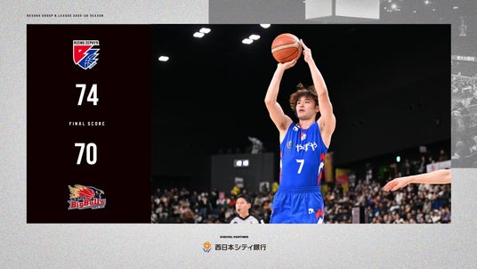 2026年2月9日(月)に開催した、りそなグループ B.LEAGUE 2025-26 シーズン【ライジングゼファーフクオカ vs.岩手ビッグブルズ】戦は、“福岡 74-70 岩手”で福岡の勝利となりました。