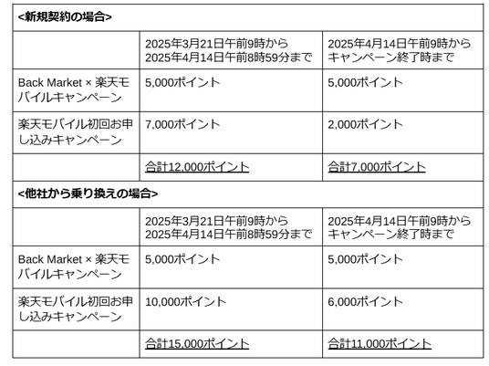 Back Marketは2014年に創業したフランス発のグローバルユニコーン企業であり、日本の主要キャリアの一つである楽天モバイルとの提携は、国内で初めての取り組みとなります。今回の提携により、Back Marketが提供するお手頃な価格かつ高品質なリファービッシュスマートフォンの購入と、全キャリアの中で最安*である「Rakuten最強プラン」の契約を組み合わせることで、よりお得にスマートフォンをご利用いただけるようになります。特に新生活のタイミングにあわせて、現在利用している携帯会社・通信プランの見直しをされている方や、お子様向けの安いスマートフォン端末および料金プランを検討しているご家族の方に対して絶好の機会となっています。楽天ポイントの獲得基準については、以下の通りです。