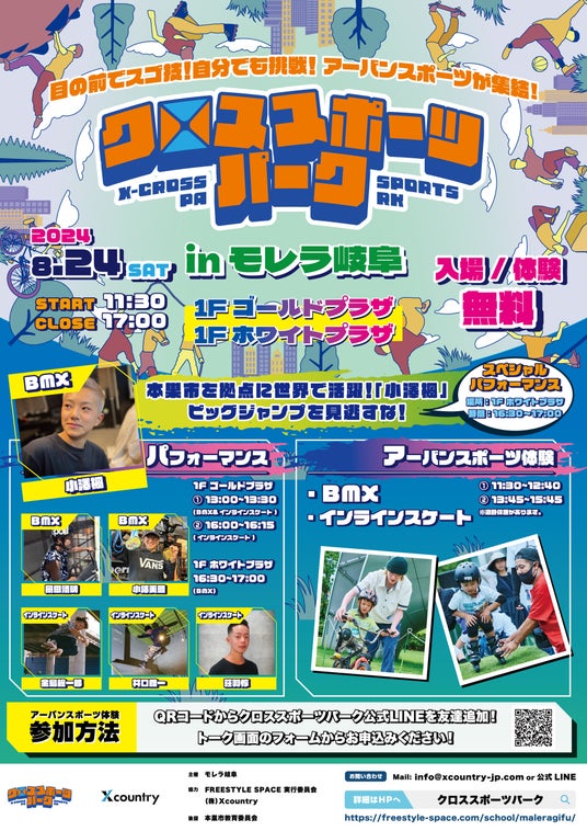 全国各地でアーバンスポーツのイベントを手がける株式会社Xcountry(東京豊島区)は、2024年8月24日(土)に岐阜県本巣市のモレラ岐阜にて「クロススポーツパーク」を開催します。クロススポーツパークでは、さまざまなアーバンスポーツを体験できることが特徴です。本イベントは、初心者でも安心して参加できるBMXとインラインスケートのワークショップを提供します。プロによるBMXの華麗なトリックとスピード、インラインスケートの流れるような動きと技術のパフォーマンスも展開され、アーバンスポーツの魅力を存分に感じられるイベントです。