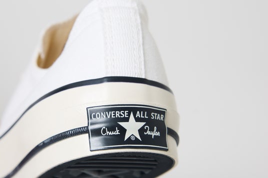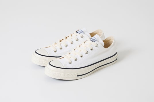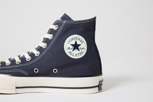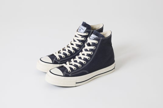 トウキャップやアウトソールにあしらわれたテープ、ソール、通称「一つ星」のヒールラベルにすべてネイビーを採用。ハイカットモデルのノッチ付きのアンクルパッチにあしらわれたスターと「CONVERSE ALL STAR」の文字もネイビーのトーナルカラーとなっています。インソールとシュータン部分には、ネイビーで両ブランドのロゴが施され、本コラボ限定のWネーム仕様に。