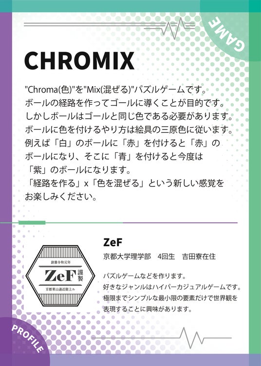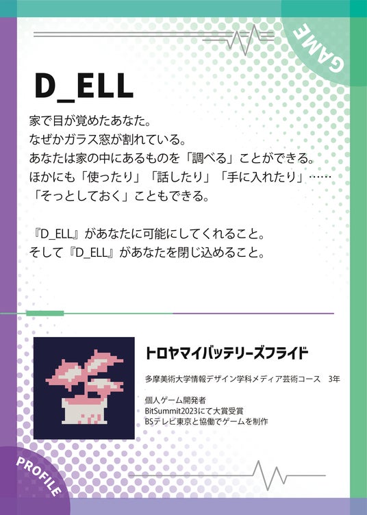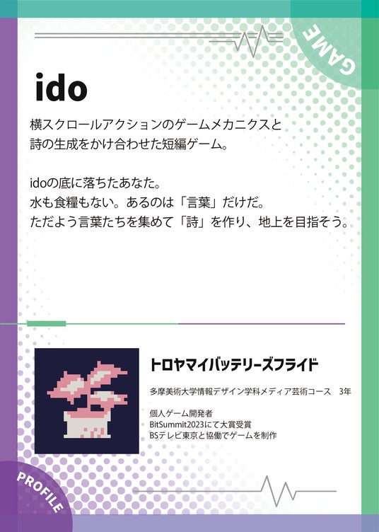 ゲームの多様な楽しみ方として、エンターテインメントとしてのゲームに留まらない、アート性のある作品のグループ展となります。現地では、個性豊かな4チームのクリエイターが制作したゲームの試遊ができる他、各クリエイターのオリジナルグッズの販売を予定してます。両日とも各クリエイターが在廊しますので、交流しながら作品をお楽しみください。