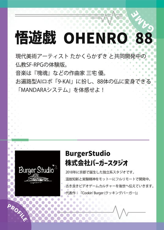 開発中タイトルの「悟遊戯 OHENRO 88」最新バージョンが遊べる他、オリジナルTシャツを販売いたします。