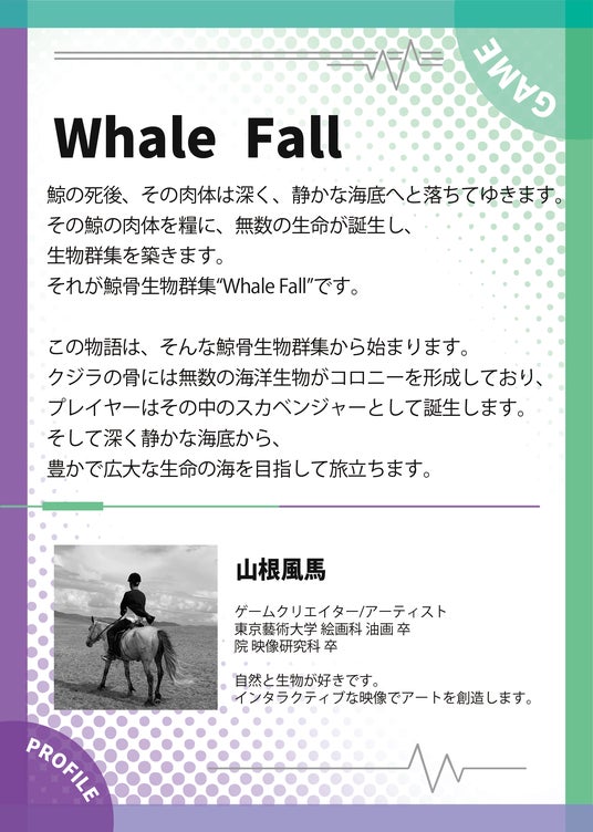 開発中タイトルの「Whale Fall」が遊べる他、イベント限定のFumaYamane直筆ドローイングを個数限定で販売いたします。