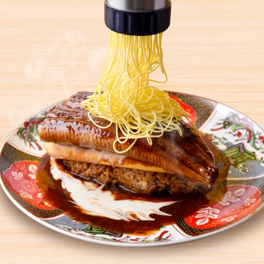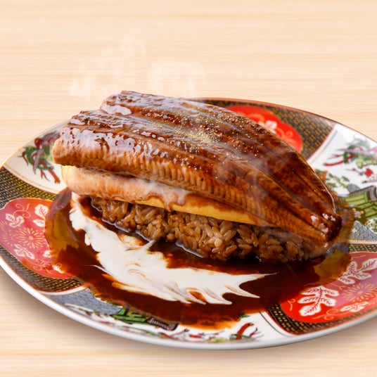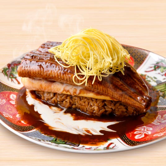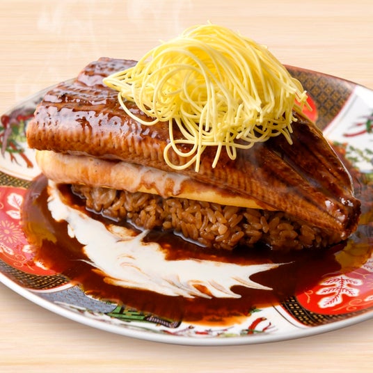 豪快にお皿からはみ出すほどの大きな鰻がインパクト大!そこへとろ~りふわふわのオムレツを重ねた大迫力の一皿!外はカリッと中はふんわり。丁寧に焼き上げた鰻が香ばしく香り立ち、食欲をそそります。ほんのり甘い卵と鰻の旨み、とろけるような脂は相性抜群!とろりと溶けたチーズと濃厚デミグラスソースがコクを重ねる至福の一皿をお召し上がりください。