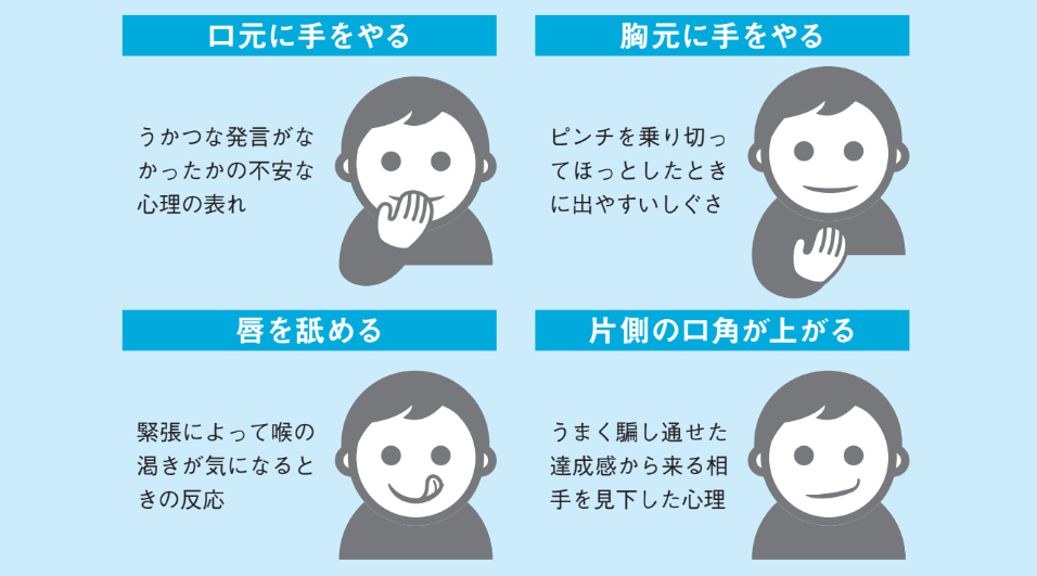 - 口元に手をやる:「うかつな発言をしてしまわなかったか」という不安な心理の裏返しとして、無意識に口を隠そうとします。