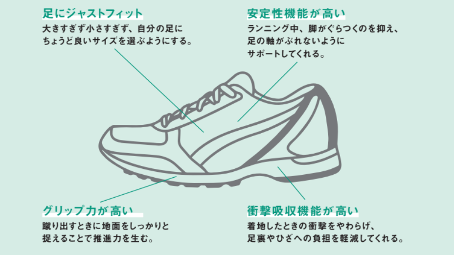 地面をしっかりと捉え、効率よく蹴り出す力(推進力)を生むソールのものを選びます。 - 衝撃吸収機能が高いこと